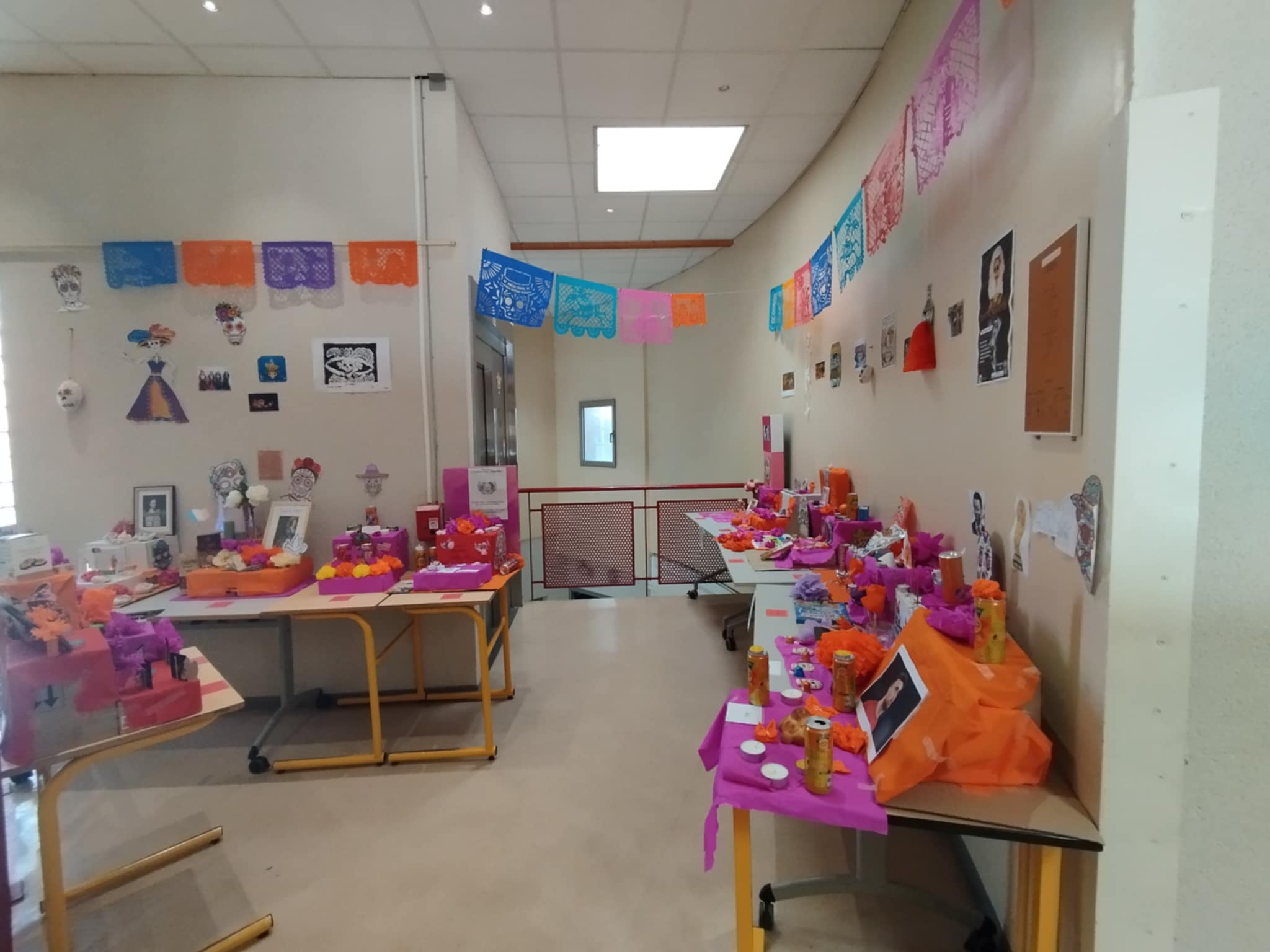 Comme chaque année depuis 5 ans, les élèves de 3ème de Mme Gatard, ont étudié la tradition mexicaine du jour des morts, ses origines aztèques, leurs croyances au sujet de la mort, toujours vivantes dans la société mexicaine qui chaque année organise une célébration unique au monde, festive, joyeuse, colorée pour rendre hommage à leurs défunts. A cette occasion, ils dressent de magnifiques autels où la couleur orange des fleurs de cempesachil domine, où sont déposés de nombreux objets symboliques et de nombreuses offrandes destinées aux morts qui dans la nuit du 2 novembre reviennent dans ce monde retrouver leurs familles qui passeront alors toute la nuit au cimetière s